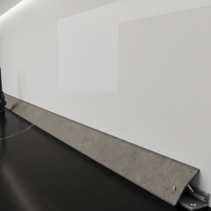 Sie besteht aus zwei Teilen – der untere Teil wird verschraubt oder geklebt auf die Arbeitsplatte und der obere wird anschließend eingeklickt in den unteren Teil. So entsteht ein fester, präziser und ästhetischer Abschluss im gleichen Dekor wie die Arbeitsplatte.