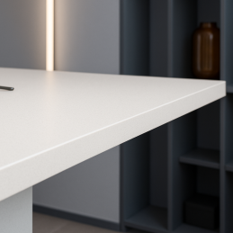 Die Platte verfügt über eine ABS-Kante, die mit Lasertechnologie an der Vorderkante verleimt ist, was ihr ein sauberes Aussehen ohne sichtbare Fugen und eine höhere Widerstandsfähigkeit gegen Feuchtigkeit verleiht.