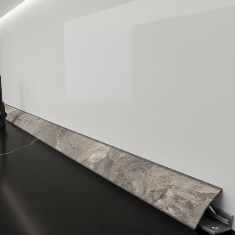 Sie besteht aus zwei Teilen – der untere Teil wird angeschraubt oder aufgeklebt auf die Arbeitsplatte und der obere wird anschließend eingeklickt in den unteren Teil, wodurch ein sauberes und elegantes Finish im gleichen Dekor wie die Arbeitsplatte entsteht.