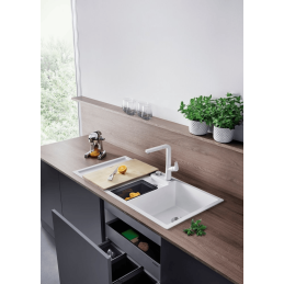 Dieses Modell ist die ideale Wahl für alle, die ein praktisches, elegantes und widerstandsfähiges Granitspülbecken suchen. Dank der intelligent gestalteten Aufbewahrungsschale, der geräumigen Abtropffläche und dem InFino®-Ablauf bringt es Komfort, Ästhetik und einfache Pflege in jede moderne Küche.