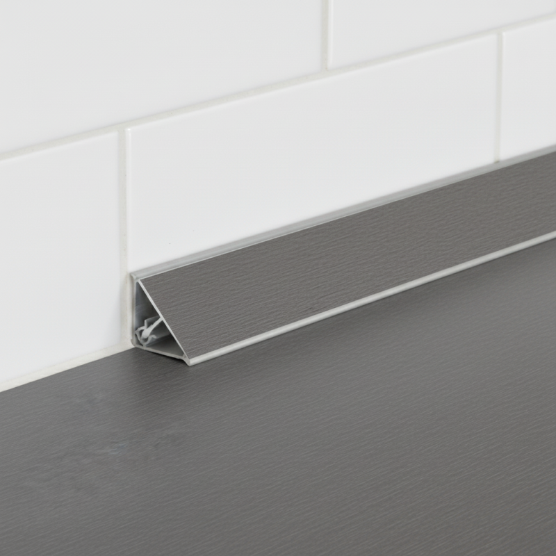 Sie besteht aus zwei Teilen – der untere Teil wird verschraubt oder verklebt auf der Arbeitsplatte und der obere wird anschließend eingeklickt in den unteren Teil. Das Ergebnis ist ein fester, präziser und einheitlicher Abschluss im gleichen Dekor wie die Arbeitsplatte.