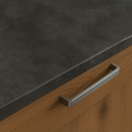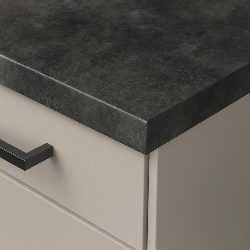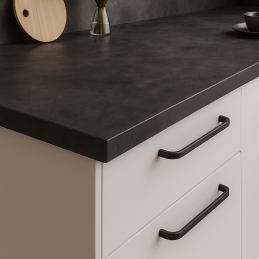 Diese Arbeitsplatte besteht aus widerstandsfähiger Spanplatte, die mit hochwertigem Laminat beschichtet ist. Dies garantiert eine hohe Widerstandsfähigkeit gegen Kratzer, Abrieb, mechanische Beanspruchung und Hitze im täglichen Gebrauch. Das moderne Dekor verleiht der Küche oder dem Arbeitsbereich ein stilvolles und elegantes Aussehen.
