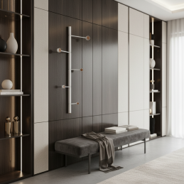 Die Konstruktion besteht aus robusten Stahlprofilen mit Pulverbeschichtung, die durch Details aus massiver Eiche ergänzt werden. Dadurch verbindet die Garderobe minimalistisches Design mit Elementen natürlicher Eleganz.