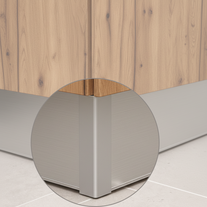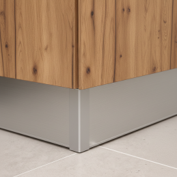 Eckverbinder im Dekor gebürstetes Aluminium ist zum Verbinden von Sockelleisten im 90°-Winkel bestimmt – ideal für saubere, stabile und ästhetische Verbindung von Küchensockeln in den Ecken der Küchenzeile.